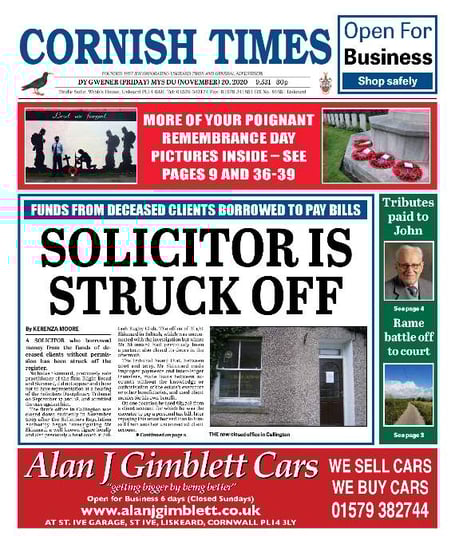 In this week’s Cornish Times, we lead on the news that a Callington based solicitor has been struck off the register and fined after breaching the rules and code of practice. We reported last year on the closure of Blight, Broad and Skinnard’s offices – now we update the story with the results of the tribunal into Nicholas Skinnard.
