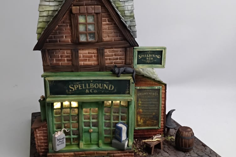 Her design, titled Tales from Spellbound & Co, recreates an old-world Victorian shop on a cobbled street – complete with tiny window panes, textured brickwork and magical details – all crafted from sponge cake, buttercream and sugar artistry in her Cornwall studio.