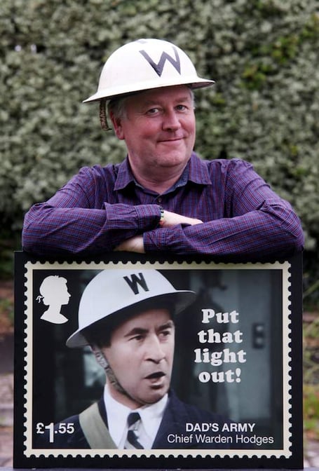 A total of eight stamps will be issued, each celebrating a key character together with their most memorable catchphrase. Bill Pertwee played Chief Warden Hodges in the series and features on one of the stamps saying “Put that light out!”