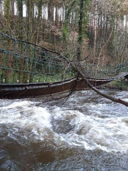 The swing bridge across the River Lynher in Stara Woods was broken when river levels swelled dramatically last week, causing a tree to be undermined.
