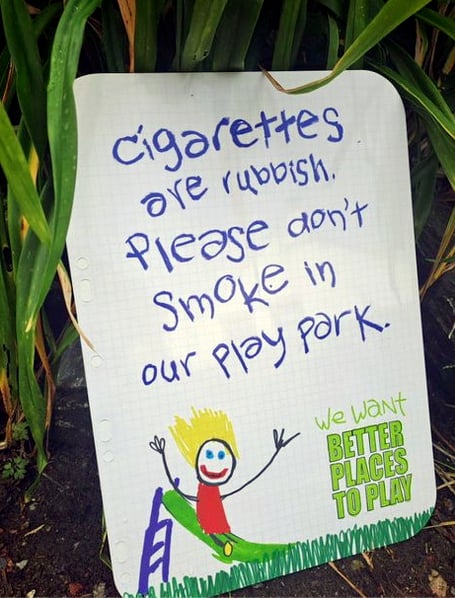 School children have helped to design signs with the words: ‘Cigarettes are rubbish. Please don’t smoke in our play park’.