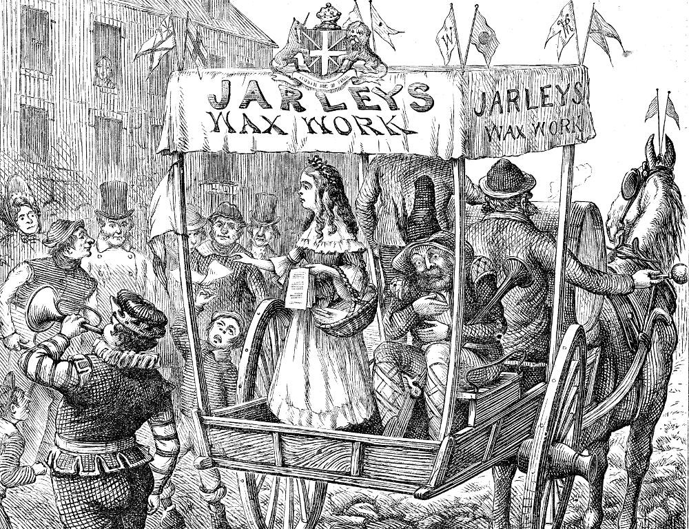 Inspired by a comic character in Charles Dickens’ novel The Old Curiosity Shop, Mrs Jarley’s Waxworks – a tableau with living people often impersonating wax dummies – became a popular Victorian amusement.