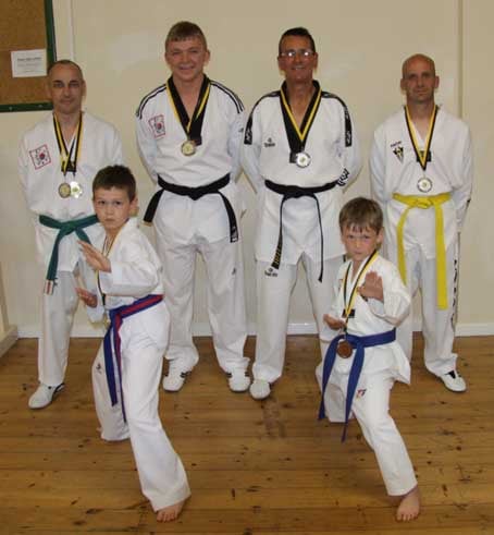 MEDAL MAGIC: This team from the Callington-based TT Taekwondo club secured a number of medals at the VW Open Taekwondo Championships in Hampshire. Back row, left to right: Paul Williams (gold medal in fighting and silver in Poomsae), Adam Leng (silver in fighting), Dale Trevail (silver in Poomsae) and Daniel Read (silver in fighting); front: Jake Williams (silver in fighting) and Liam Read (bronze in poomsae). Missing the photo-call was Stephen Lamb (silver in fighting)